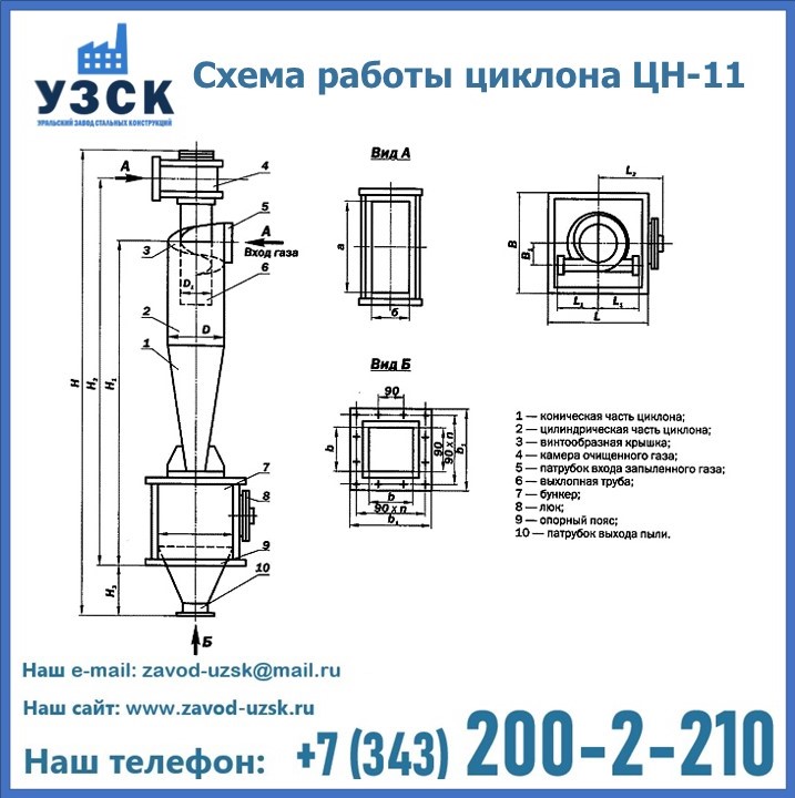 При этом ощутимой разницы в цене между универсальным и узконаправленным, подобранным в соответствии с конкретными техническими требованиями циклоном, нет. Стоимость воздухоочистительного оборудования типа циклон обусловлена маркой и толщиной стали, из которого он изготовлен, сложностью и специфичностью конструкции, наличием дополнительного оснащения (бункер, улитка и другие). При необходимости, на заводе УЗСК в Волгодонске будет изготовлен циклон по индивидуальным техническим чертежам заказчика.